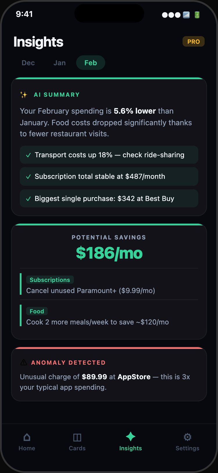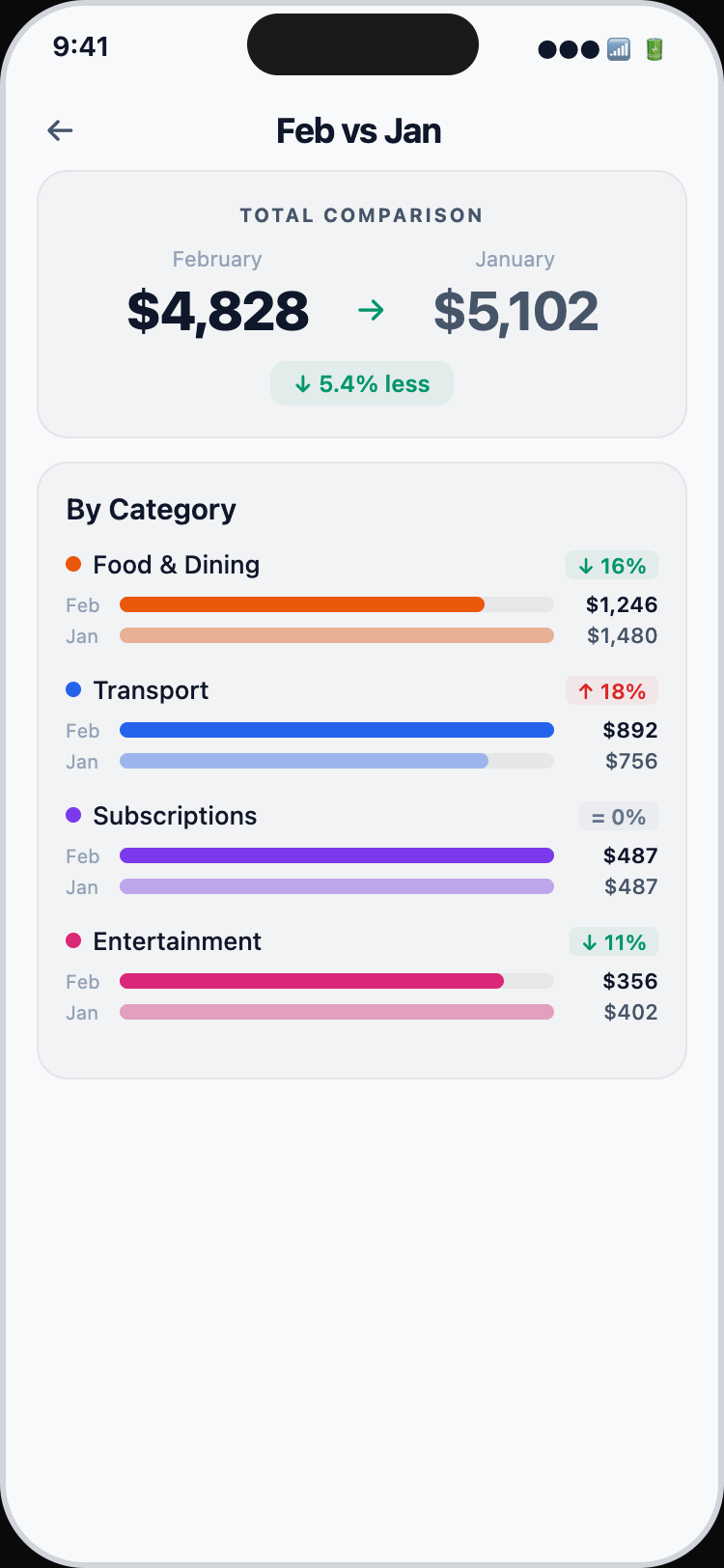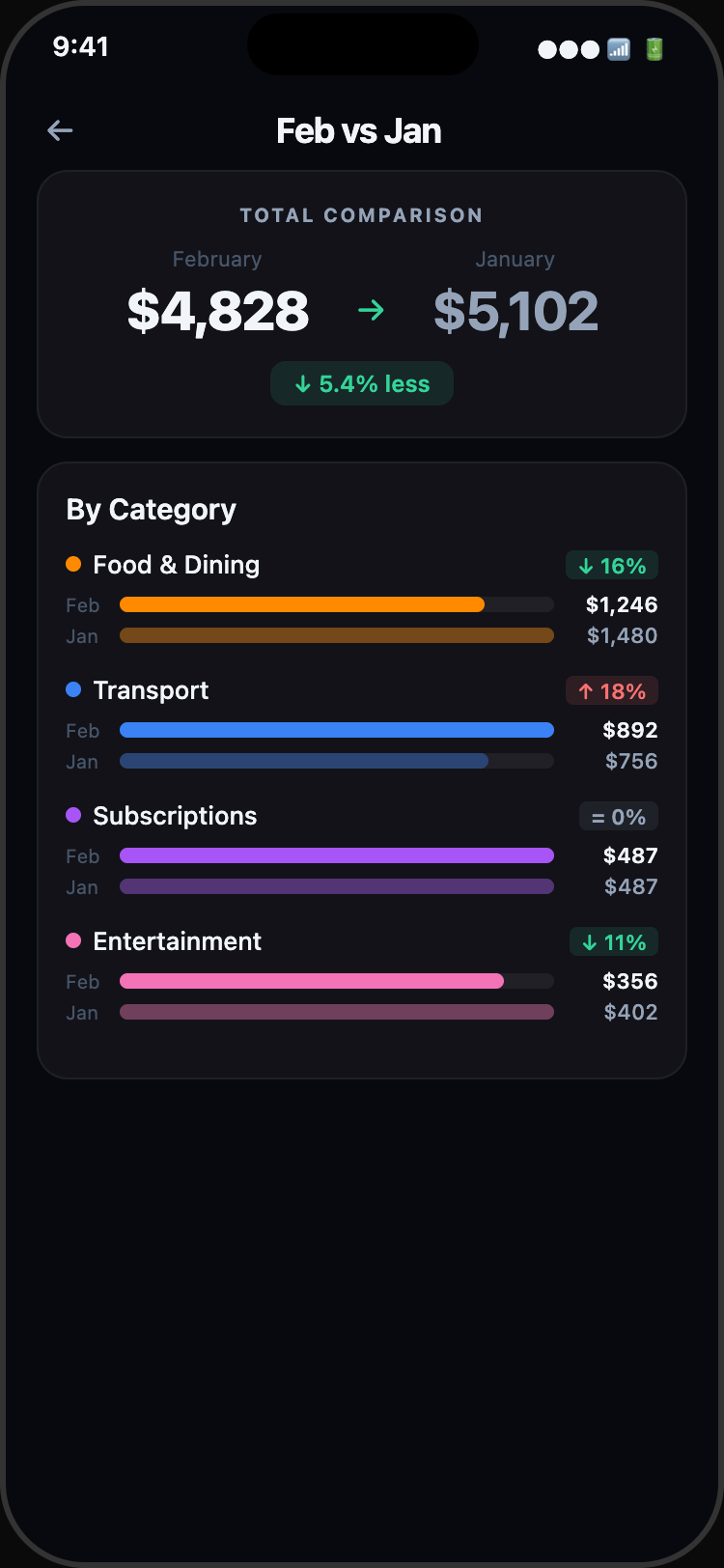 Go beyond charts. Get a narrative of your spending habits, compare months side-by-side, and export your data for deeper analysis.