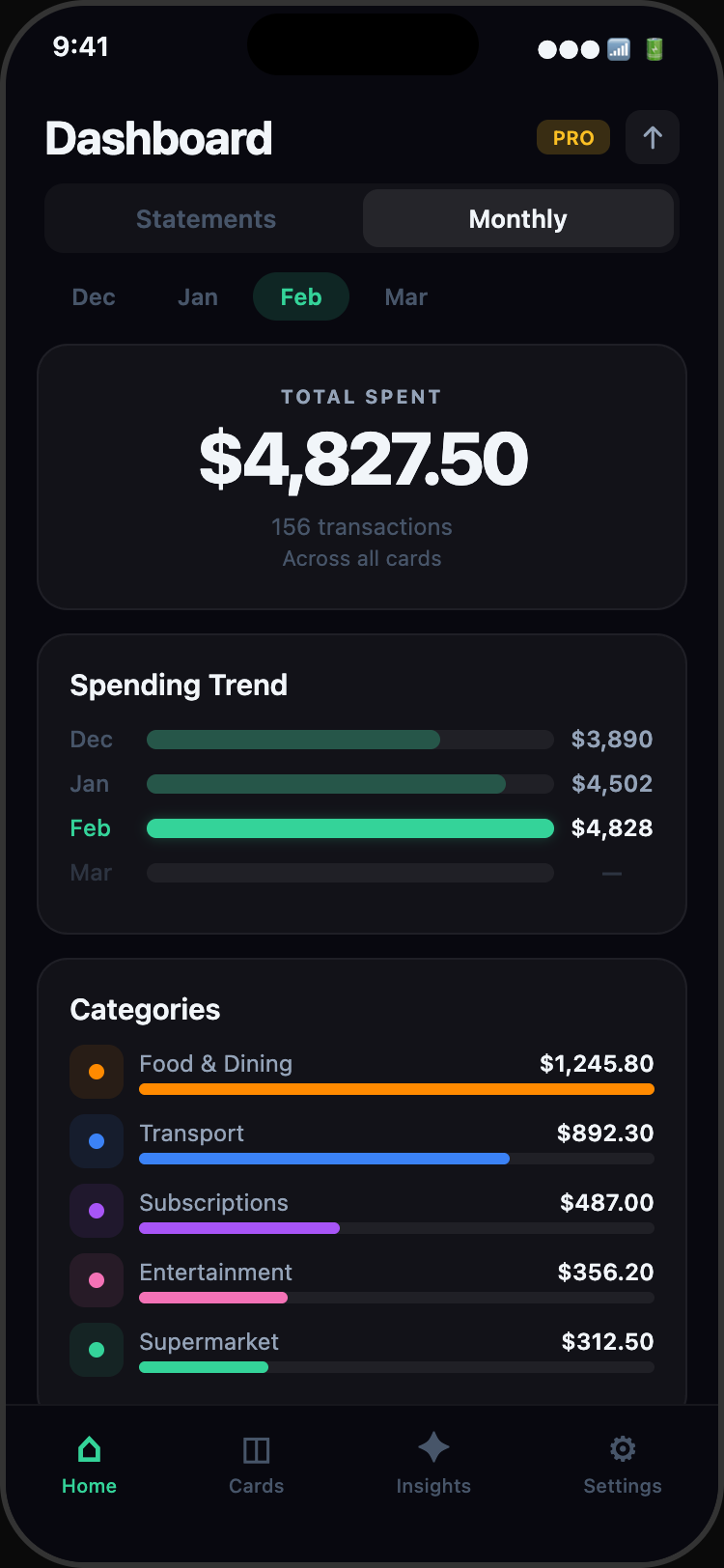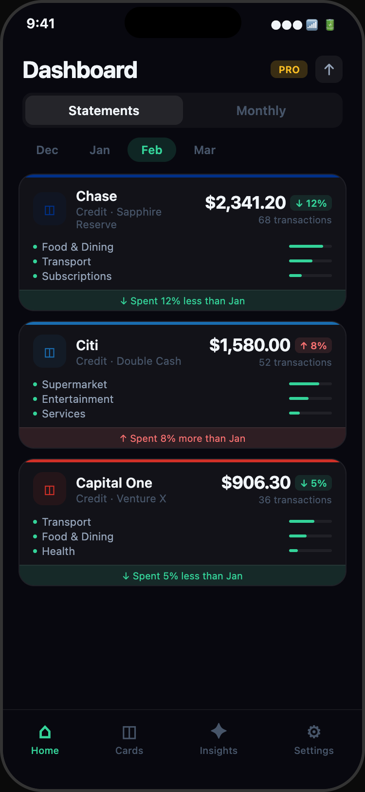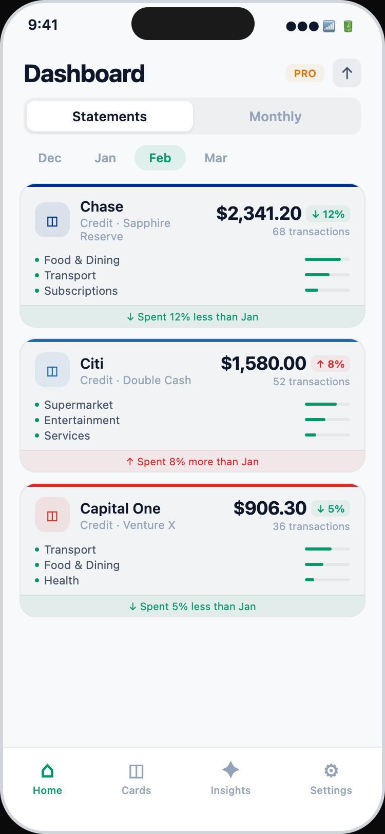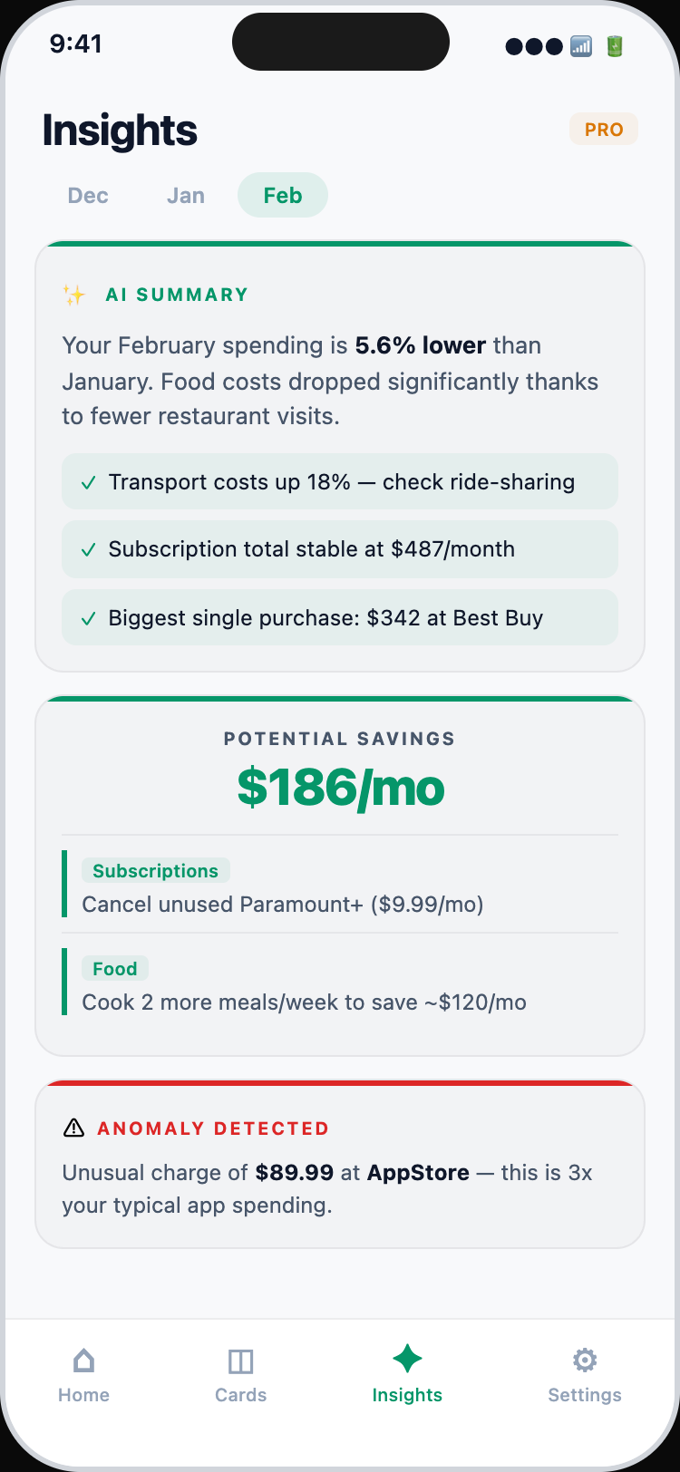 Go beyond charts. Get a narrative of your spending habits, compare months side-by-side, and export your data for deeper analysis.