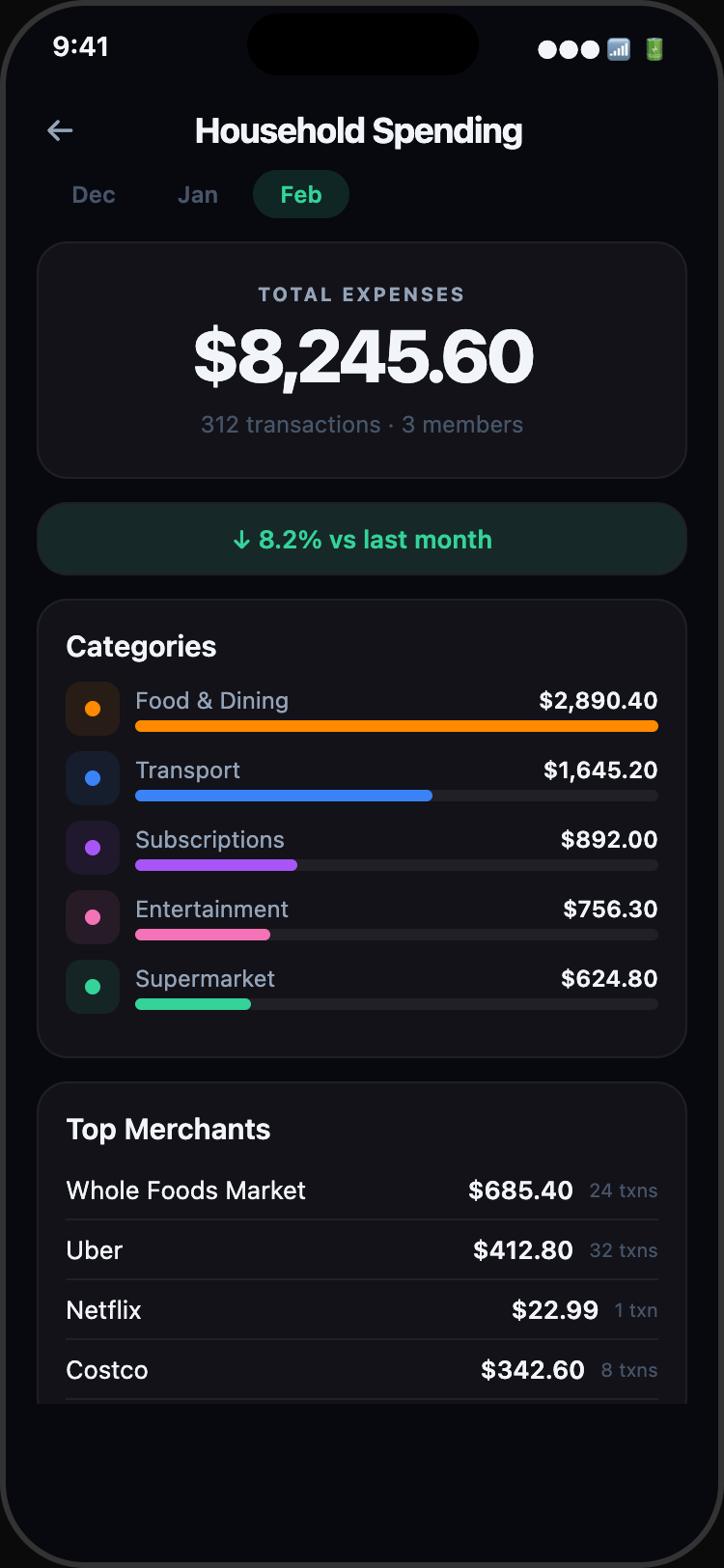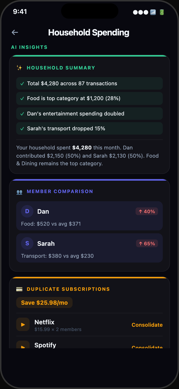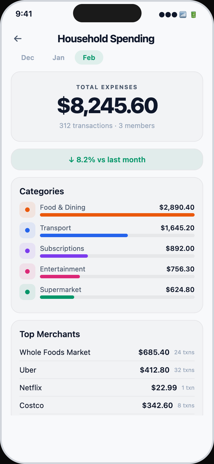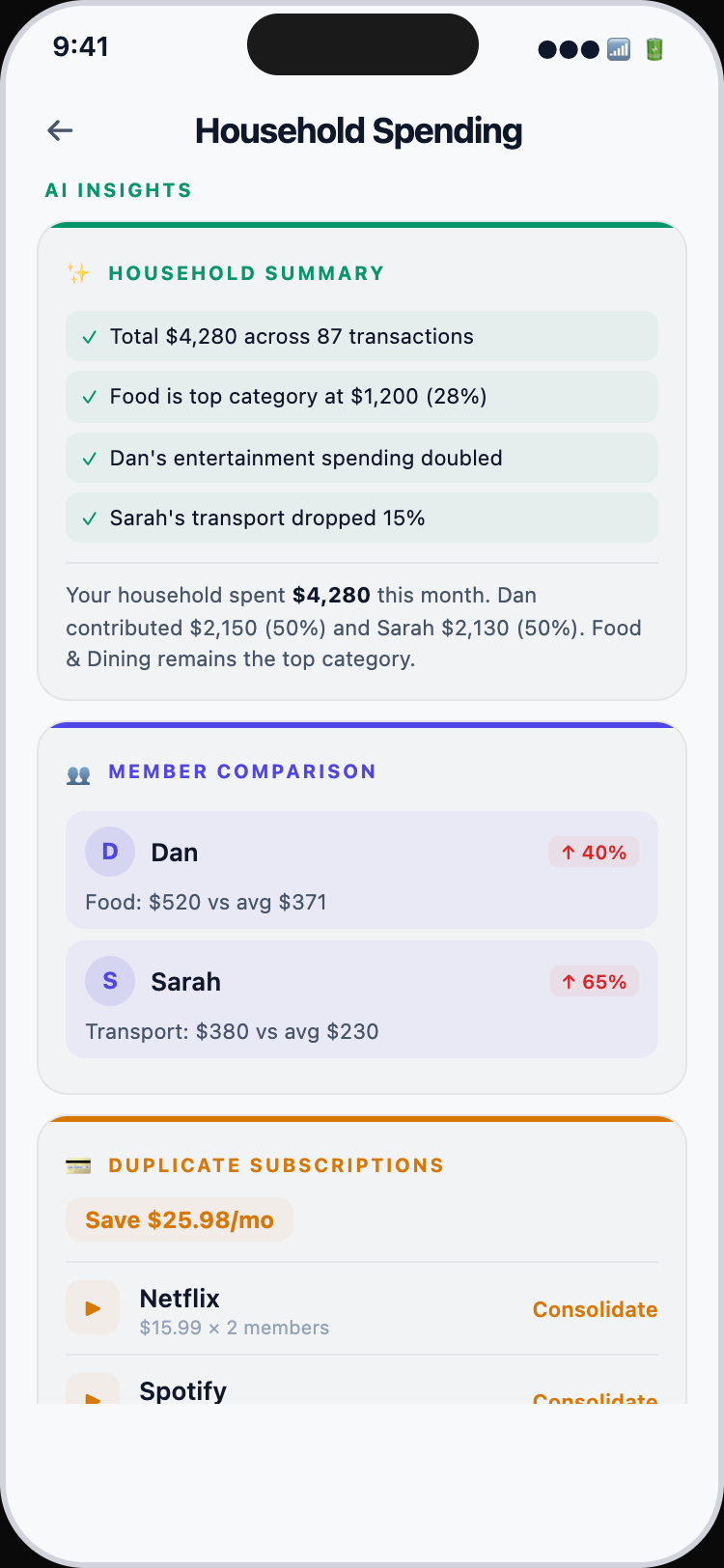 Track spending together. Create a household, invite your family or roommates, and see combined expenses in one dashboard.