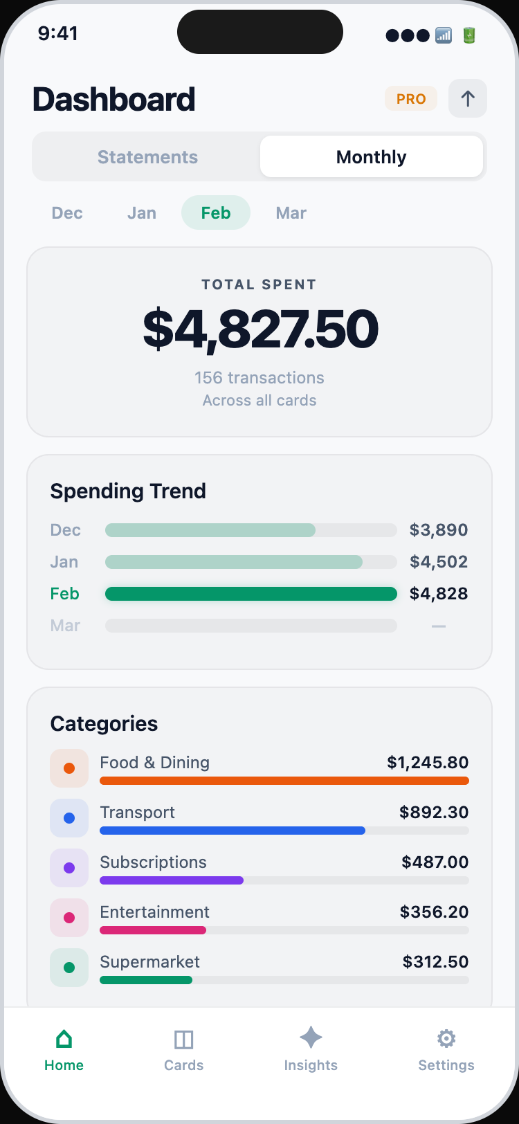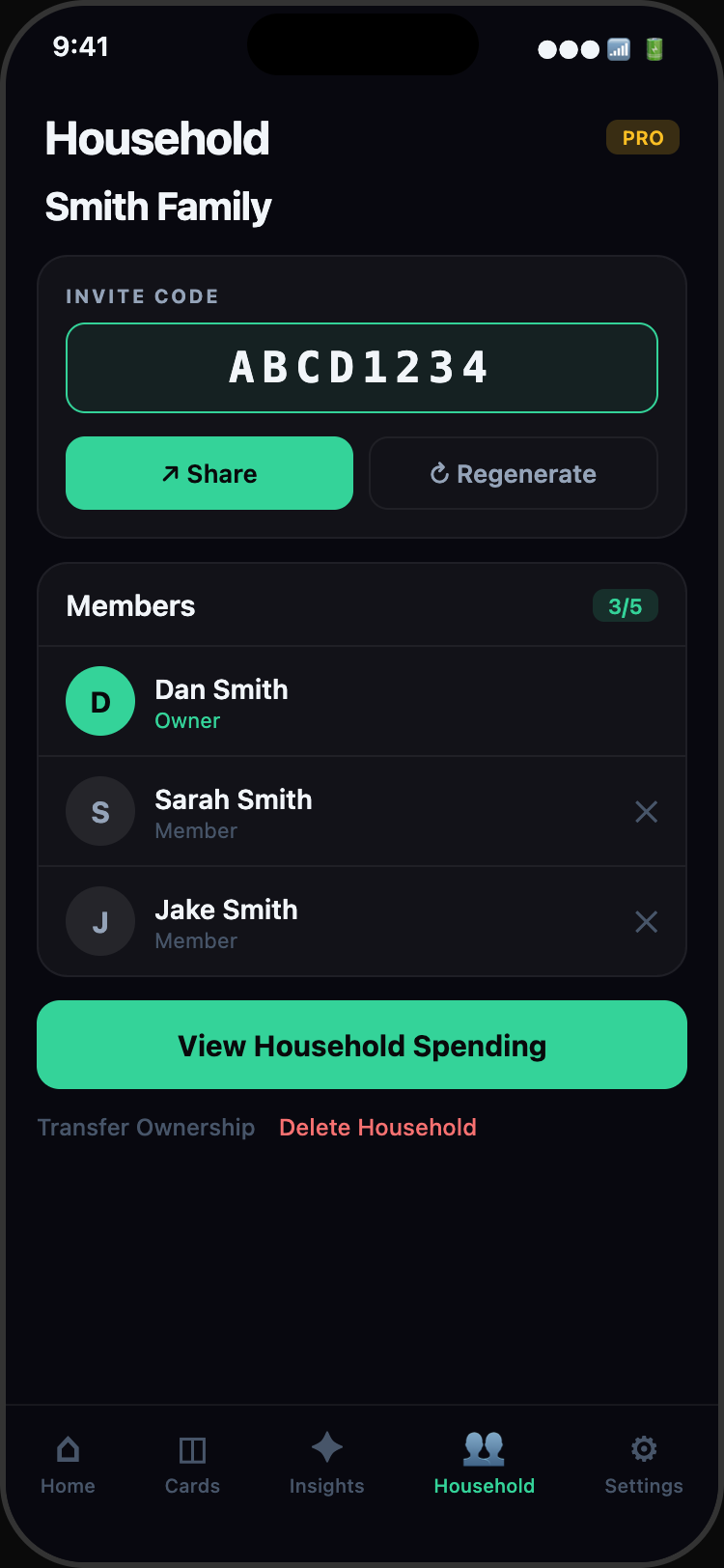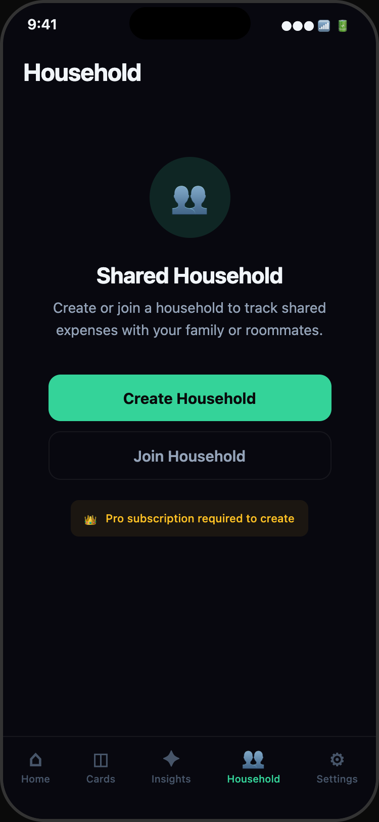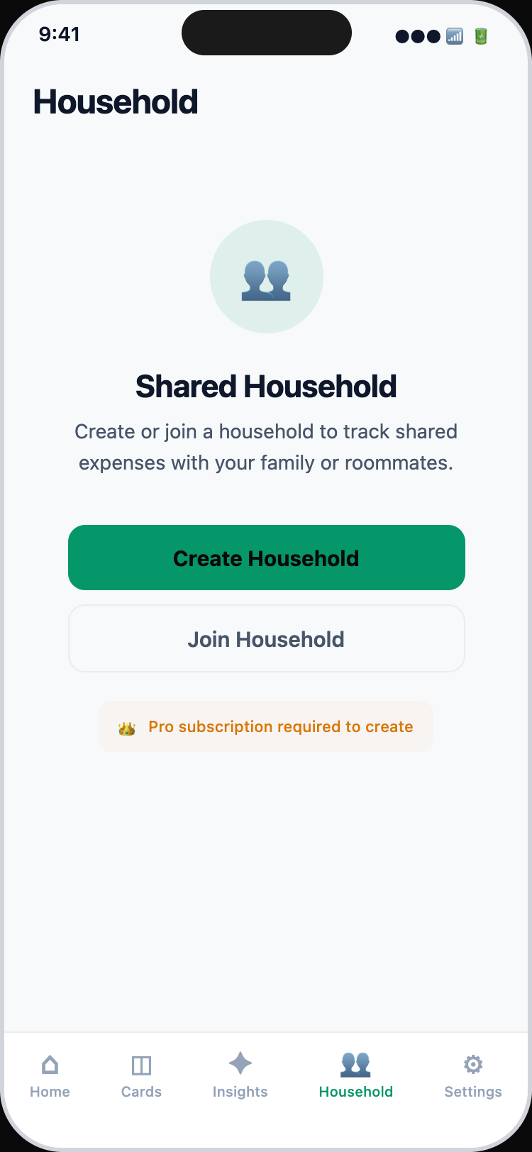 Track spending together. Create a household, invite your family or roommates, and see combined expenses in one dashboard.