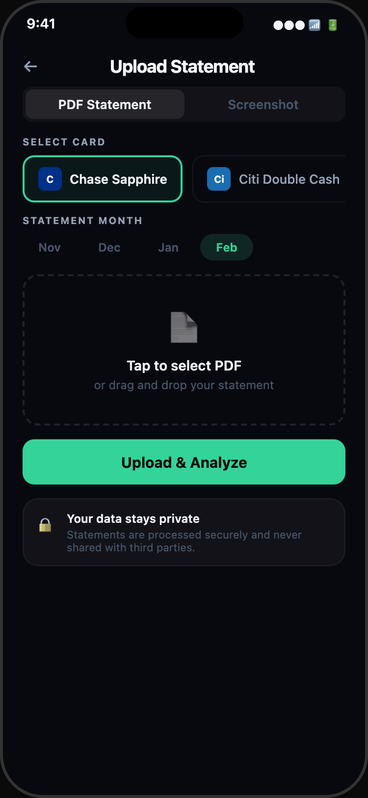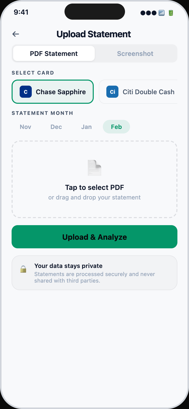 Upload a PDF or take a screenshot of your bank statement. Choose which pages to analyze with the page selector.